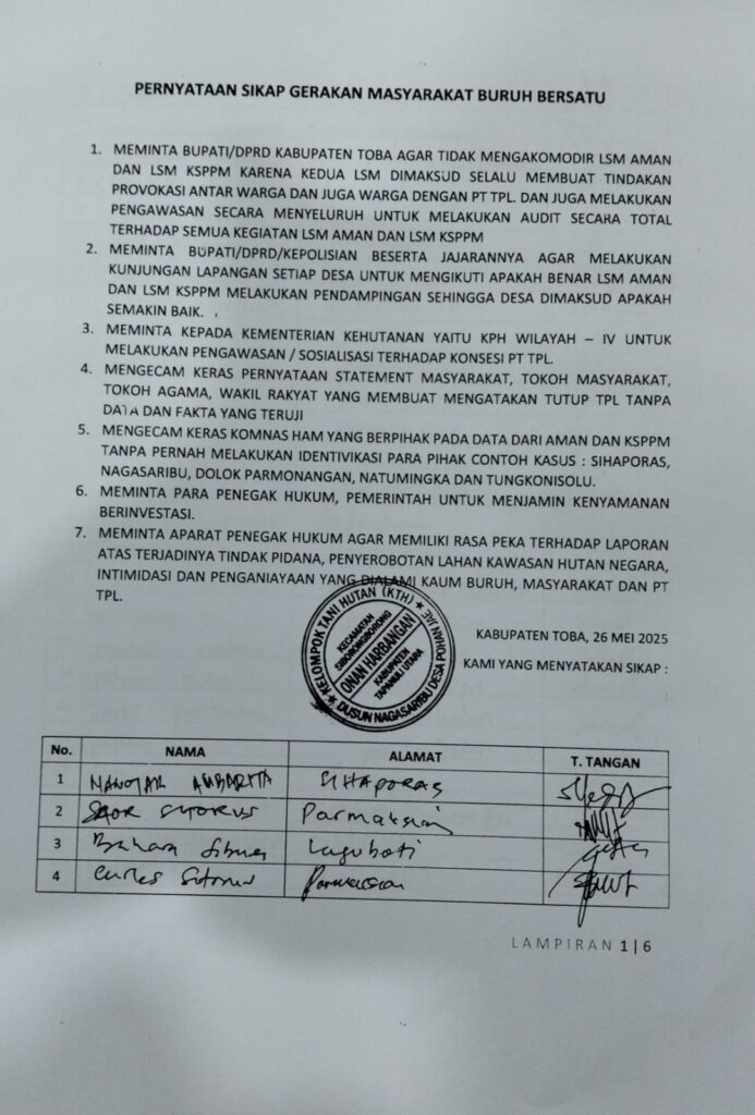 “Kami minta pula agar Pemkab Toba mengundang KSPPM dan AMAN serta GMBB untuk duduk bersama membahas soal tanah adat dan lingkungan. Kami sendiri yang akan menutup TPL jika memang terbukti merusak lingkungan. Jadi KSPPM dan AMAN itu jangan hanya pandai di medsos melontarkan provokasinya bahwa TPL perusak lingkungan walau tanpa bukti-bukti nyata”, imbuh Bahara.