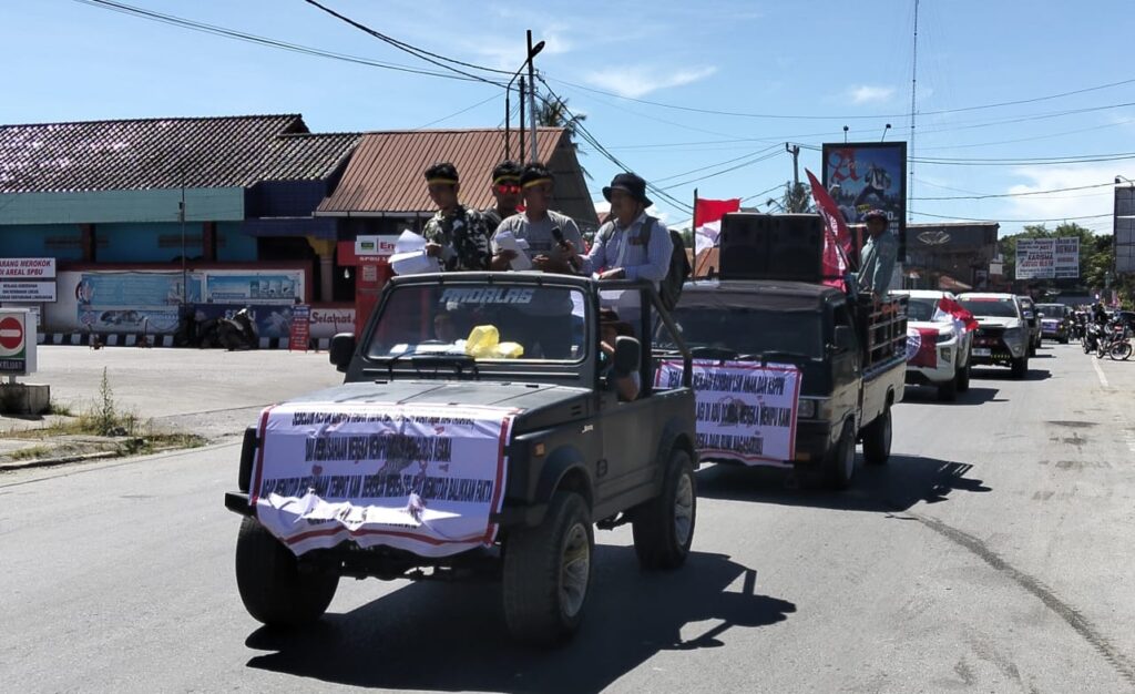 Lima puluhan mobil dan truk serta ratusan masyarakat dan buruh ramaikan aksi GMBB di Balige.