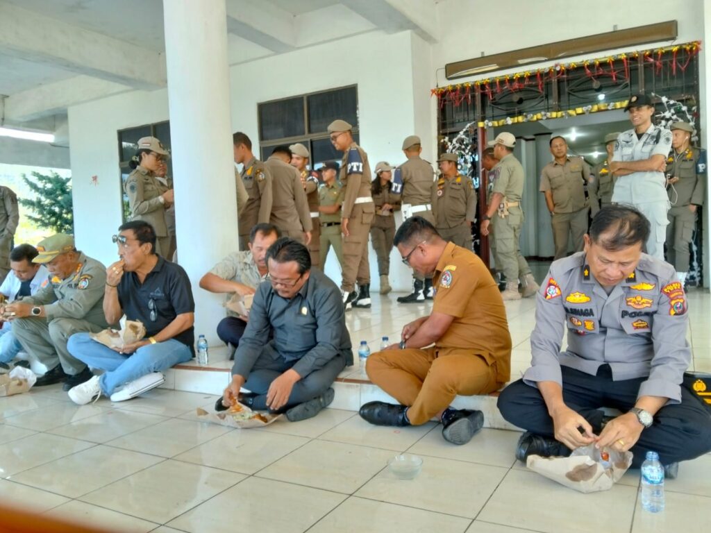 Ketua dan Plt Sekretaris DPRD Toba, Donald Simanjuntak, serta Kompol D Sinaga dan tokoh masyarakat Welman Sianipar makan bareng dengan massa GMBB di lantai teras gedung DPRD Toba.